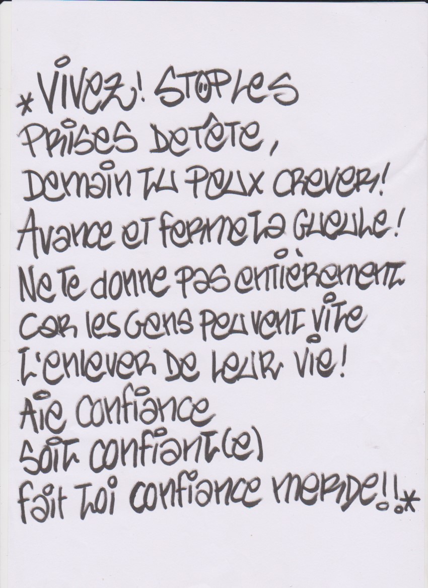 Alors que nous, arlequins sans masque, même ronflant dans nos camions, la rave n'en finit pas ; toujours les kicks font vibrer les cordes de nos veines. Nos cargos fixés sur la peau, la teuf n'est plus une parenthèse exotique, la techno un sombre boum-boum à écouter que sous taz. Se croyant au Carnaval, où chacun se vêtit d'un costume différent du sien, ils portent tous les même habits, assignés à ces fameuses "free-party" ; mais ces habits sont les nôtres, n'en faites pas des clichés.