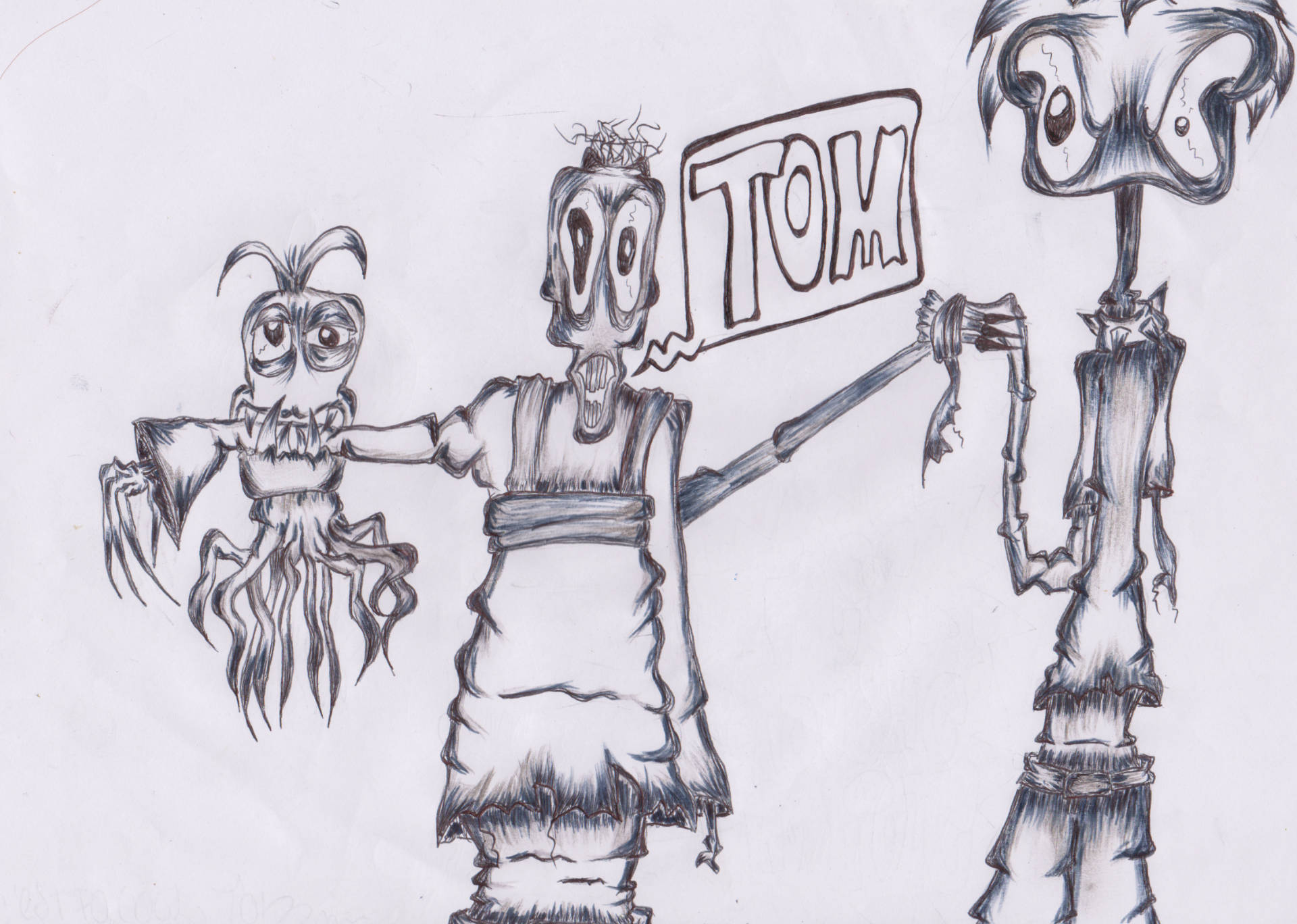 Malgré qu'il se proclame Anarchiste, Tom est con, très con. Tom choppe des esclaves, voici le premier qu'il a eu. Il l'a appelé " Spoolding". Il lui a appris à ne dire que le prénom de Tom, du coup pour s'exprimer Spoolding ne sait que dire Tom. En cadeau Spooling lui a ramené un parasite inhibé de tous sentiment, aussi lâche que l'opportuniste de Dutronc qui retourne sa veste, sans remord qui s’appelle adolf. Adolf est bête, c'est une bête. Tom ne sait même pas ce qu'il fou là, mais en tout cas il est là. Au fil du temps Tom en aura marre de voir sa gueule et va donc lui amputer ses petites testicules.. euh tentacules pardon ( puisque évidemment Adolf n'a pas de couilles..) puis il coupera sa tête pour l'afficher fièrement chez lui sur un piquet. Sacré Tom!